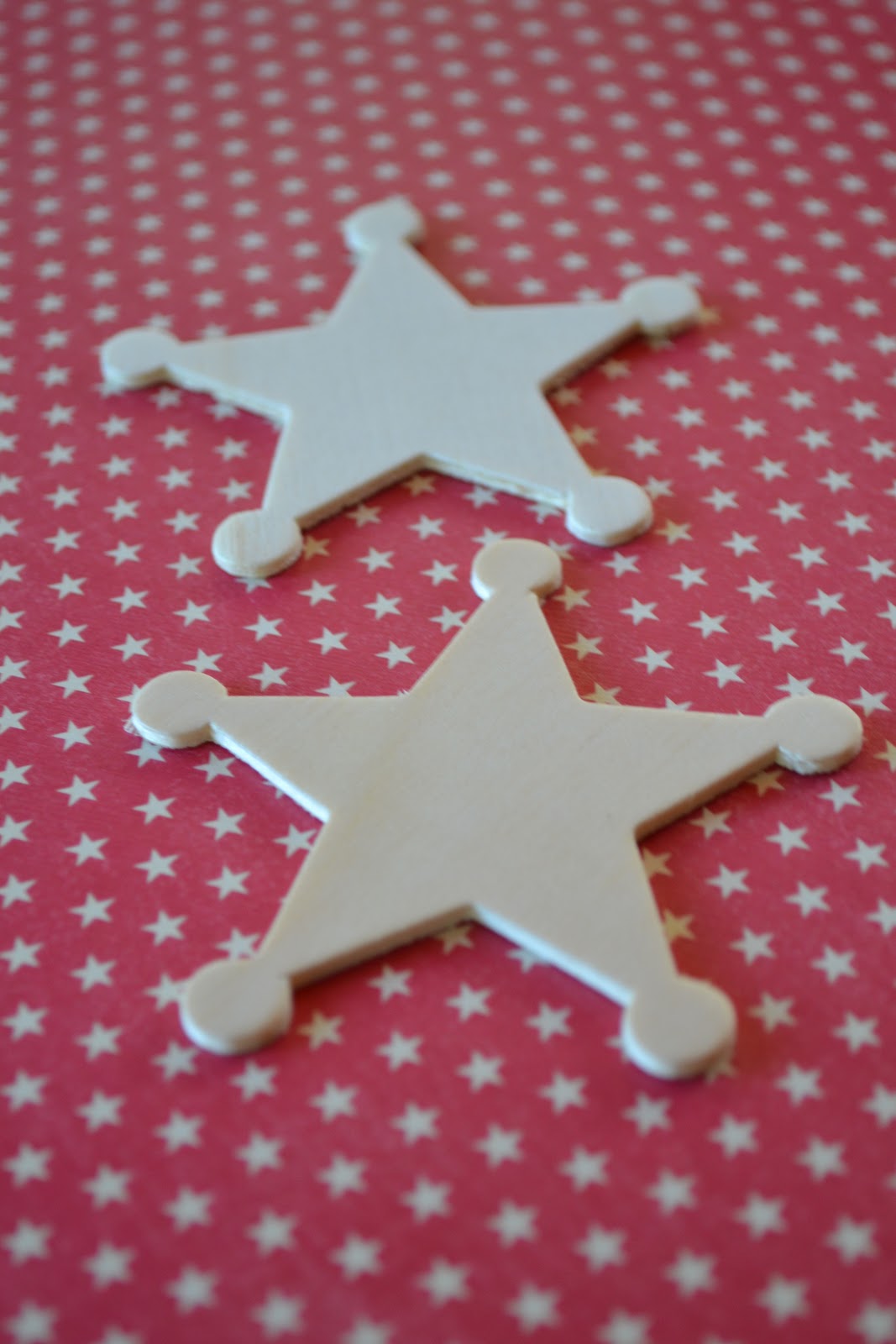 Using Modge Podge, my daughter and I made these sherriff badges with some pretty paper. Some of the paper was scrapbook paper, some came from Funkytime and some came from photocopying a print from a Cath Kidston bag. I traced the wooden badges and added two coats of glue.
